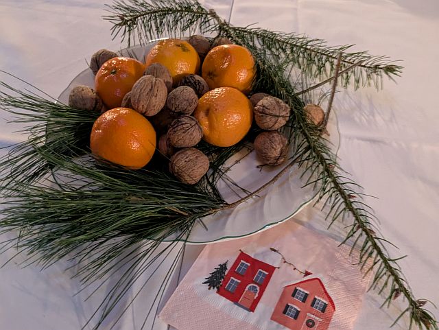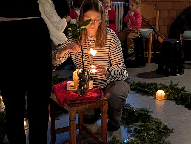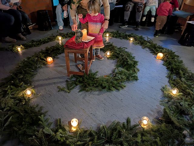 In der festlich dekorierten Scheune war die Adventspirale mit einer brennenden Kerze in der Mitte aufgebaut. Nach der Einleitung einer Erzieherin, begleiteten die Mütter/Väter nacheinander ihr Kind durch die Spirale aus Tannengrün. Unterwegs nahmen sie ein Glas mit einem Teelicht und entzündeten es gemeinsam an der großen Kerze. Feierlich trugen die Kinder ihre Kerze und setzten sie an dem Rand ab. Nach dem gemeinsamen Gesang von Adventsliedern, kam der Nikolaus durch die Tür.