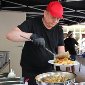 Festlich eingestimmt, freuten sich die Besucher auf kühle Getränke, leckere Speisen und besonders auf die selbstgebackenen Kuchen. Die Inklusionsfirma Priska versorgte mit köstlichen herzhaften Speisen. Nach einer Stärkung wurden die Verkaufsangebote und Mitmachaktionen rege angenommen.